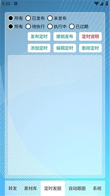 定时自动发圈是一款超棒的社交媒体智能工具。它能解决咱们发朋友圈的不少难题呢!操作简单易上手,支持文字、图文、链接等内容定时发布,还能批量发送。有丰富的文本、图片及视频模板,帮咱轻松创作高质量朋友圈内容。能在线跟踪转发好友朋友圈,一键批量微信设备设置发圈,定时发送多种类型朋友圈,实现统一云控管理。一键配置发送时间、频率、内容和评论后,就能全自动发送朋友圈推广啦。使用也方便,打开应用可下载好友朋友圈素材,在素材库管理发圈素材,随时设置本机定时发圈任务,还能在线跟踪转发。有了它,发朋友圈更轻松,节省时间,还能同步发圈,让你的社交分享更高效,赶紧来本站下载体验吧!