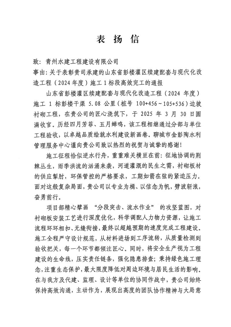 聊城市金彭陶水利管理服务中心在表彰信中特别指出,青州水建“以专业为桨、以信念为帆”,展现出“水利铁军”的责任担当和行业领军者的技术实力。