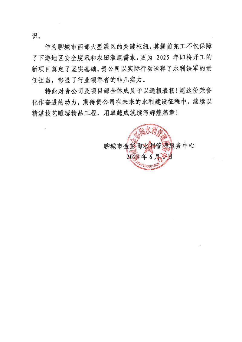 近日,公司收到聊城市金彭陶水利管理服务中心发来的表彰通报,对公司承建的山东省彭楼灌区续建配套与现代化改造工程(2024年度)施工1标段高效优质完工给予高度评价,并予以通报表扬。