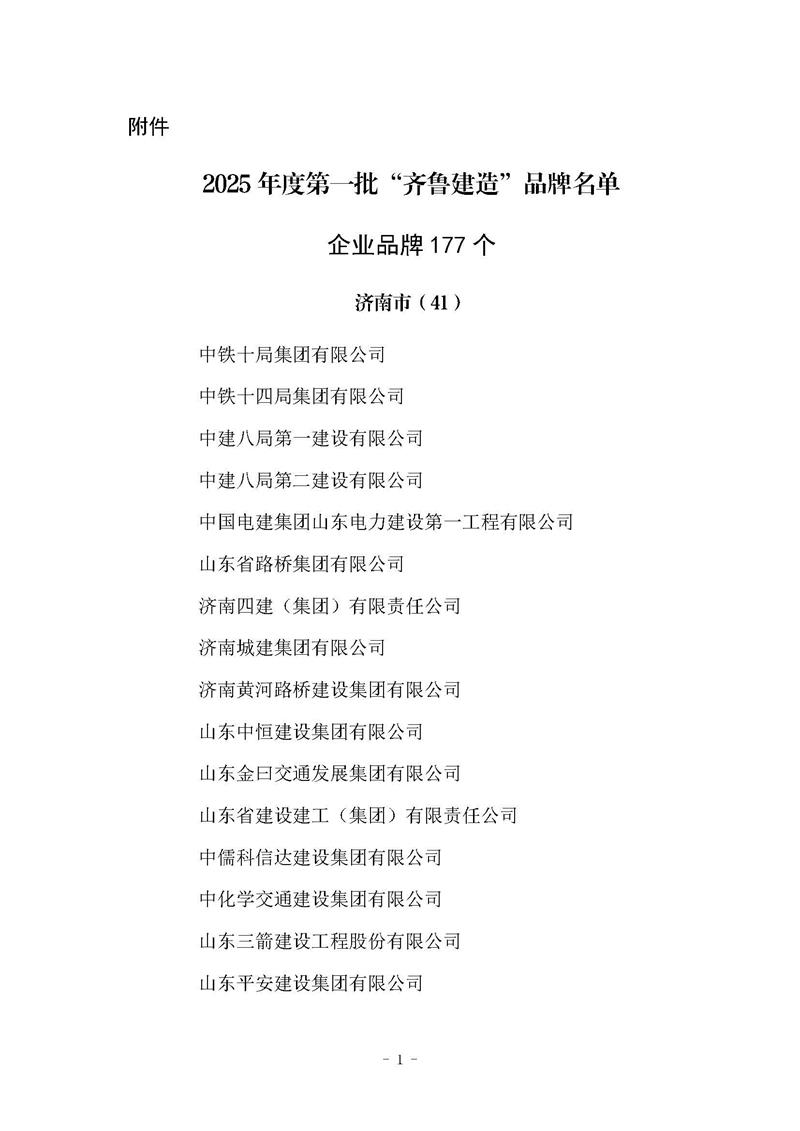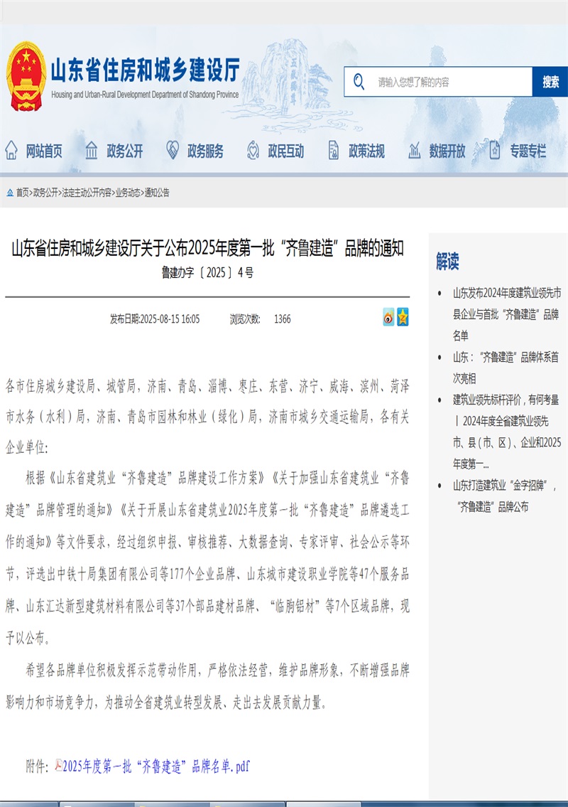 近日,山东省住房和城乡建设厅公布2025年度第一批“齐鲁建造”品牌名单,公司凭借卓越的工程质量、技术创新能力及社会贡献成功入选。